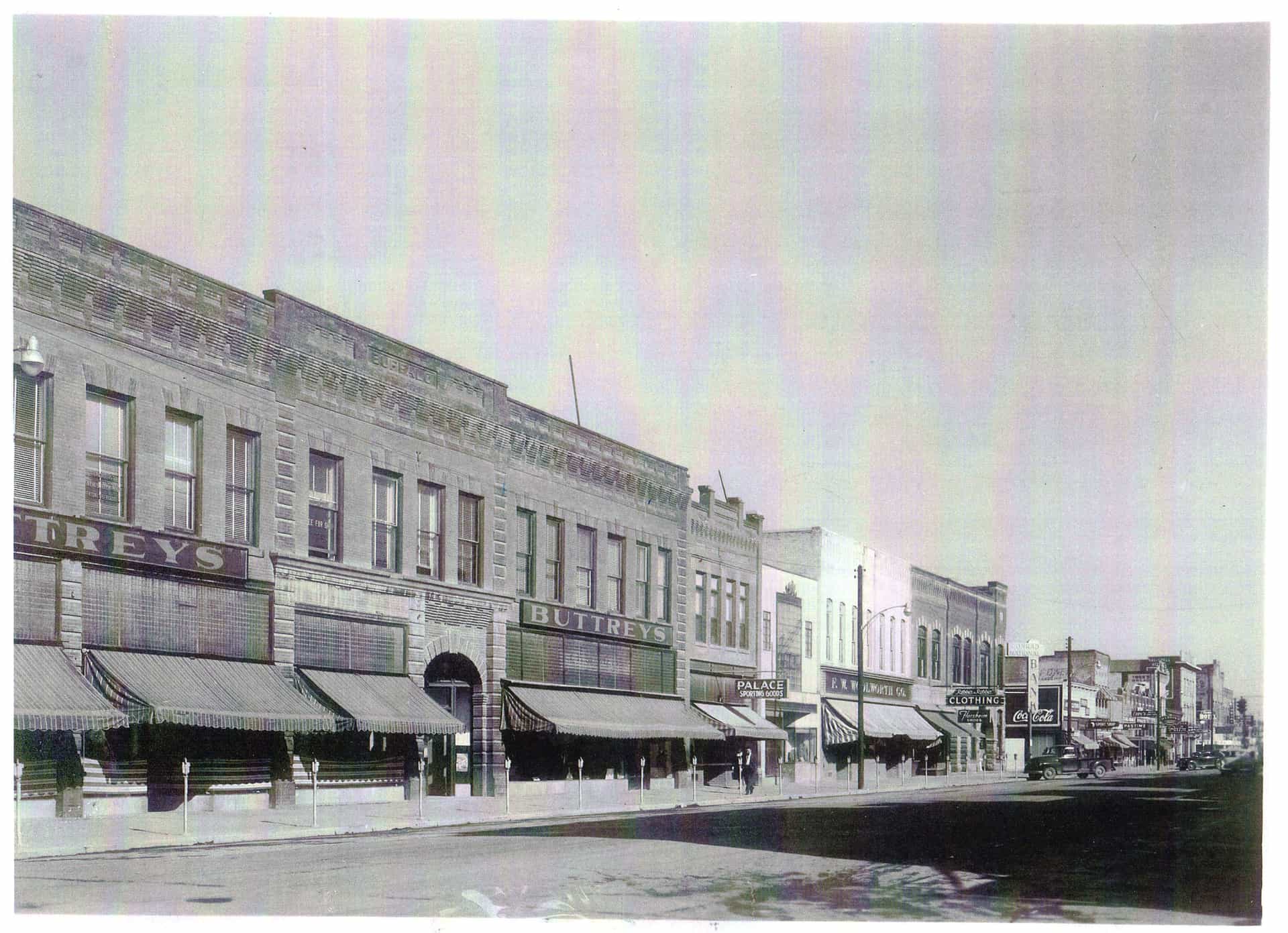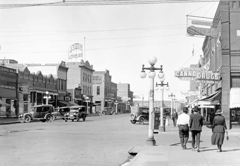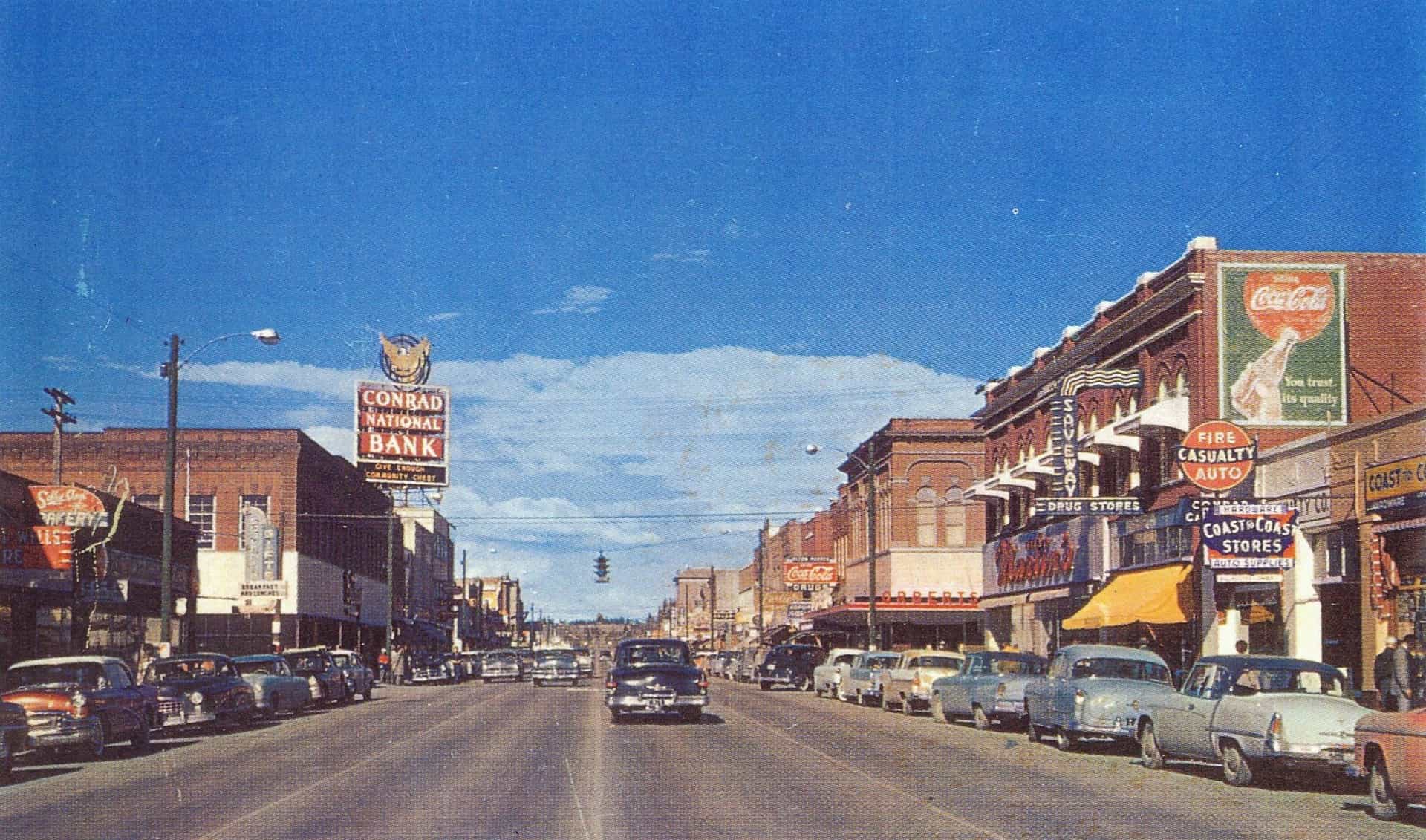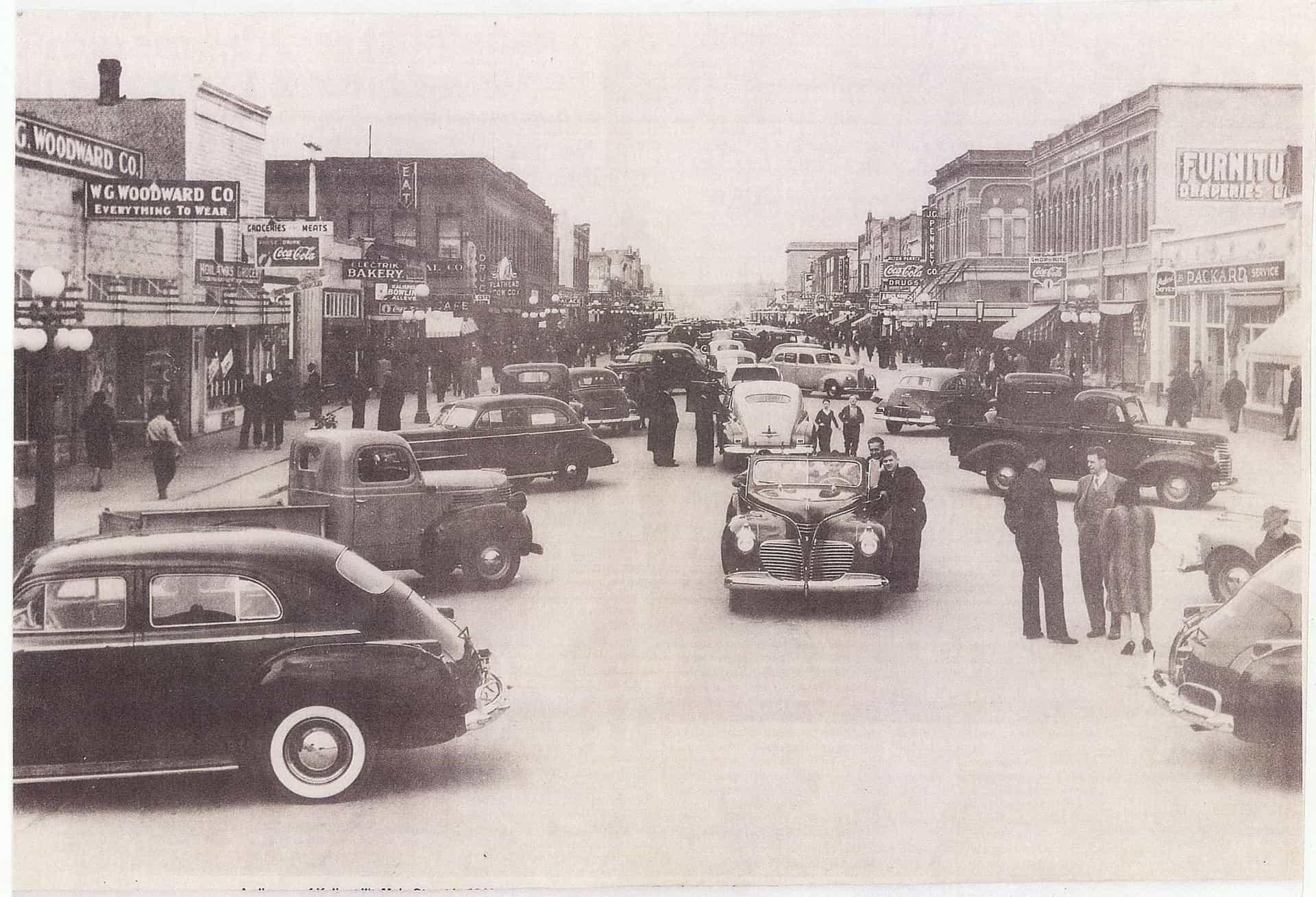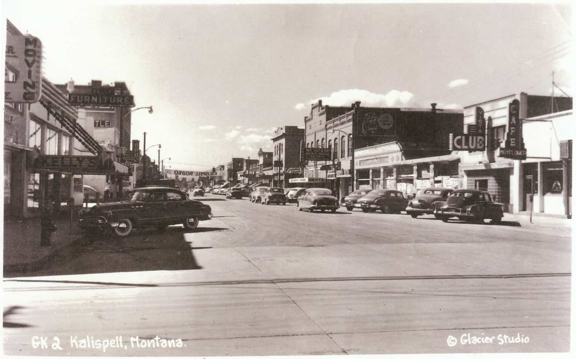 Angled view to northwest from east sidewalk on Main Street. Decorative street lamps line the sidewalks on both sides and numerous automobiles are parked along the street, one driving in the street, while people walk on the sidewalk. National Park Highway signs are pasted to two street lamps. Visible buildings and establishments include (from left to right) Kalispell Drug Co., The Palm Bowling Alley, Kalispell Hotel, McIntosh Music House, Opera House, Glacier Park Garage, National Hotel, Listle Cafe, Glacier Park Cafe, McCutcheon's Cafeteria, Cannon's clothing store, Jones Drug Co. and the Ford Hotel. Catalog #948-823 Source: Montana Historical Society Research Center Photograph Archives, Helena, Montana
