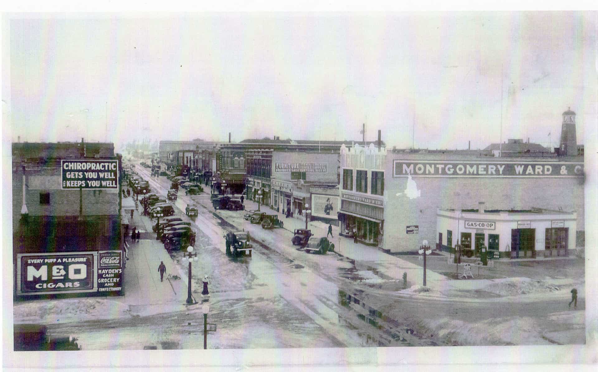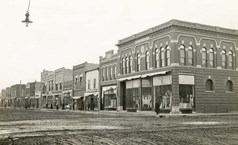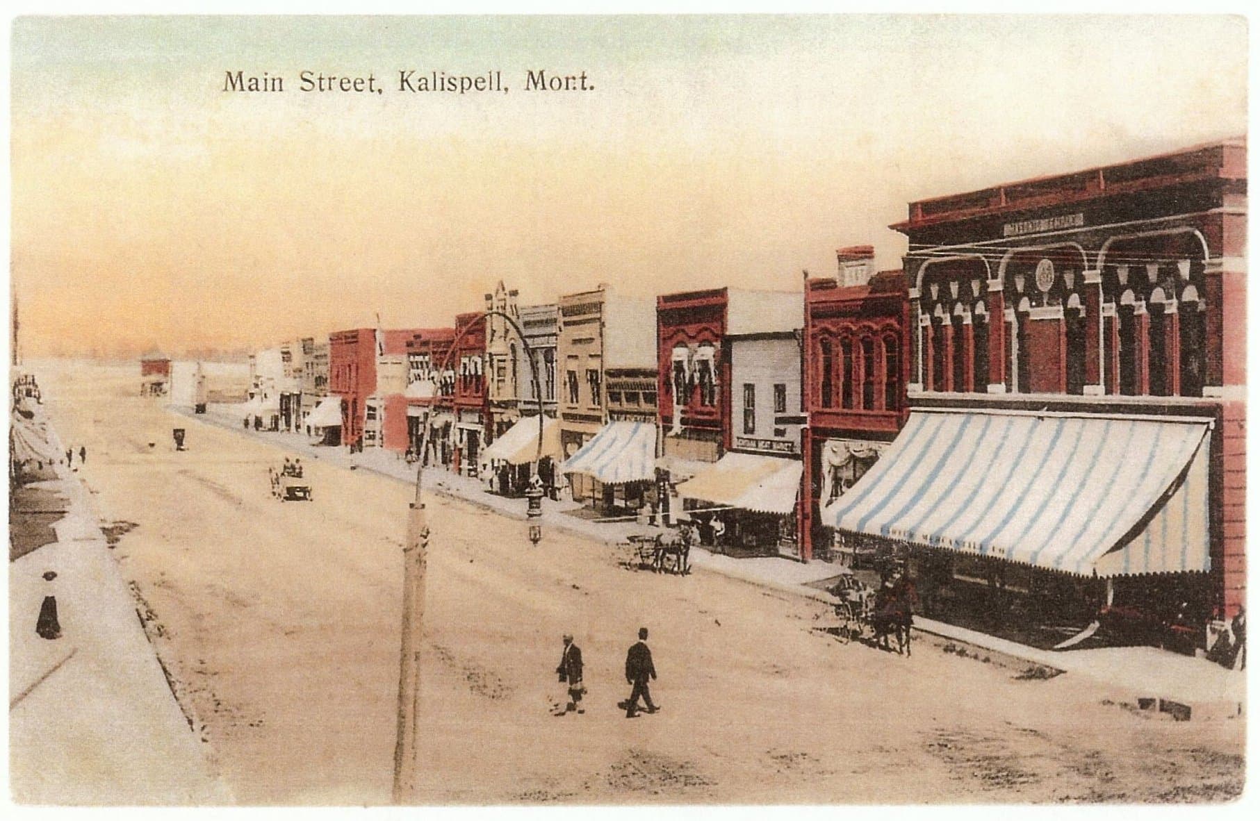 View of the Carter Mercantile Co., the Masonic Temple, K&T Building, and the Montana Meat Market, from the corner of Third St., East, and Main St., looking north, Kalispell, Montana; an electric street lamp hangs from a wire over the dirt street as people walk on the sidewalk. Catalog #948-815 Source: Montana Historical Society Research Center Photograph Archives, Helena, Montana